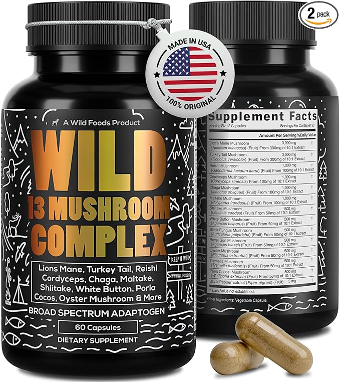 Wild Foods Premium Mushroom Supplement Complex | Mushroom Extract 13 Organic Mushrooms: Lions Mane, Turkey Tail, Reishi & More Adaptogenic Mushrooms for Energy, Brain & Immune Health (Pack of 2)