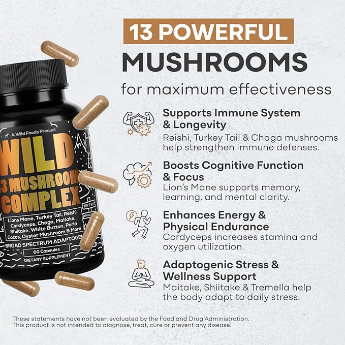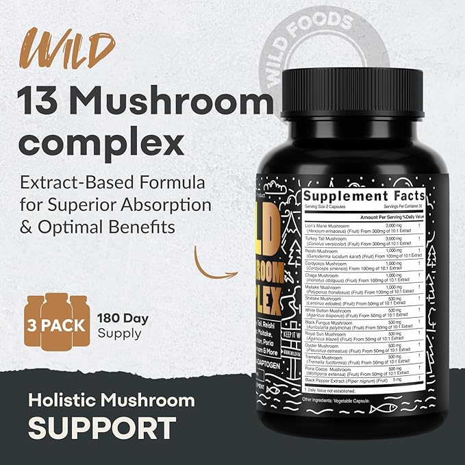 - Organic & Highly Potent Mushroom Blend: Wild Foods mushroom complex capsules are a potent blend of 13 USDA-certified organic mushrooms. Includes: Lions Mane, Turkey Tail, Reishi, Cordyceps, Chaga, Shiitake, Maitake, Tremella, Oyster mushrooms and more
