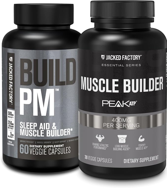 Jacked Factory Build PM Night Time Muscle Builder & Sleep Aid (60 Capsules) & Essentials Muscle Builder - Daily Strength Builder for Men with Peak ATP (30 Capsules)