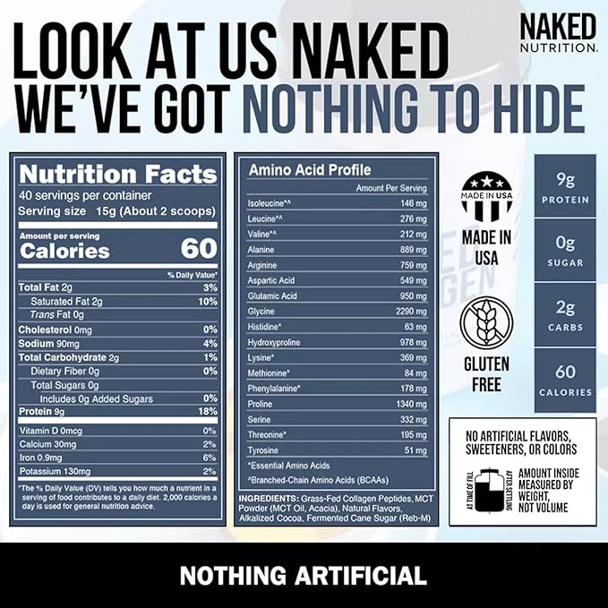 - NAKED MEANS NOTHING ARTIFICIAL: 100% Premium Mocha Collagen Creamer from grass-fed and pasture-raised European bovine hides. Contains no artificial sweeteners, flavors, or colors and is GMO-Free, Dairy-Free, Soy Free, and Gluten-Free. No rBGH or rBST.