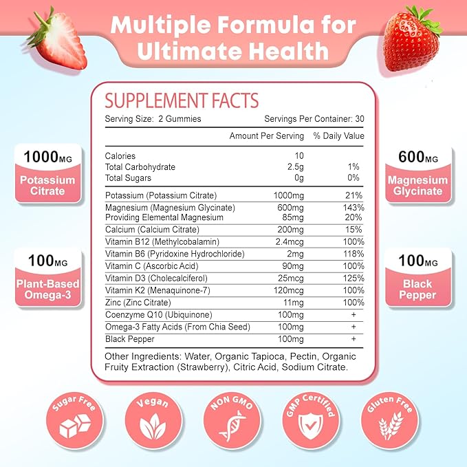 - Sugar Free, Organic & Vegan: Each bottle has 60 sugar-free, vegan, organic strawberry flavored potassium magnesium gummies for adults. It's a 30 - day supply. Taking 2 gummies daily supports your body well, suitable for adults, kids, women, and men