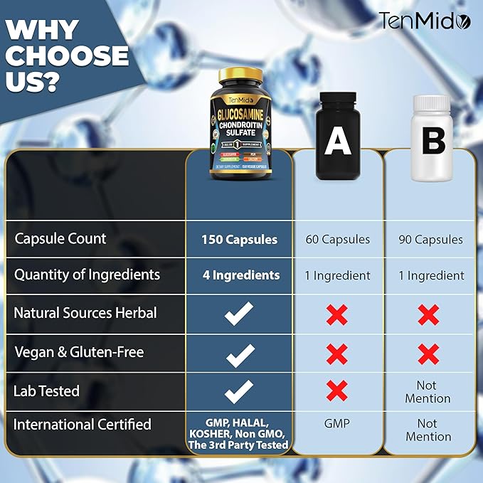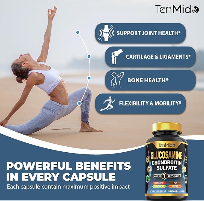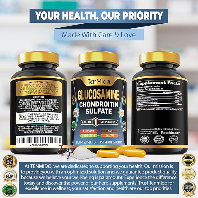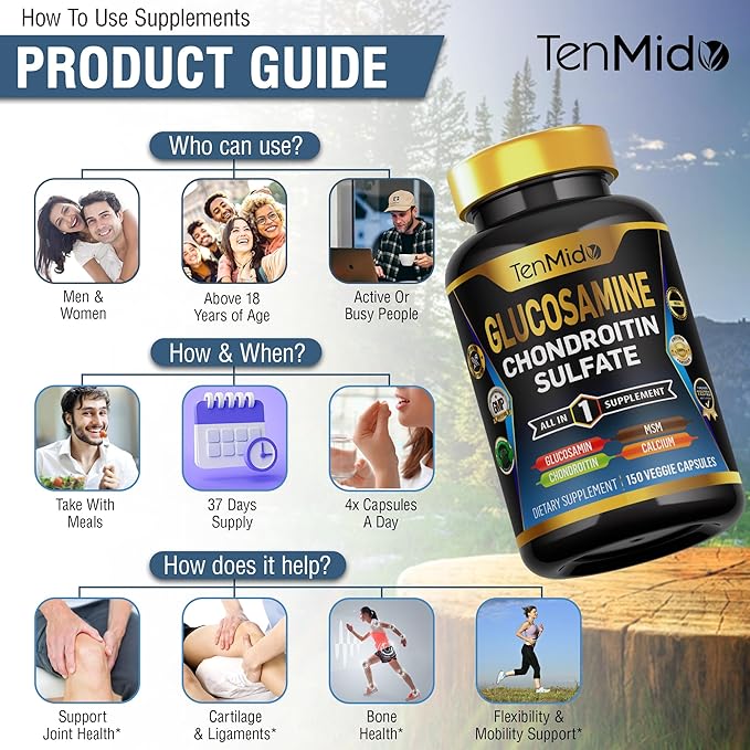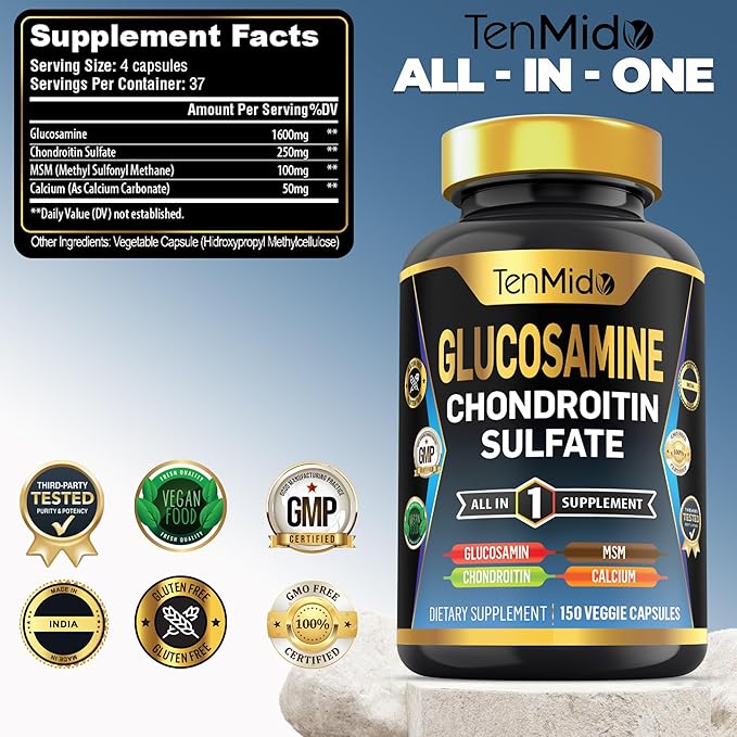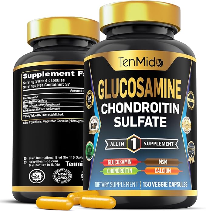 - ❤️ Advanced Formula with a comprehensive combination of Glucosamine, Chondroitin Sulfate, MSM, Calcium for Women and Men. Tenmido has developed a potent all-in-one supplement, enriched with 4 potent ingredients. This concentrated Glucosamine supplement presents a rich blend of nutrients, promotes optimal joint mobility, energy, and comprehensive reinforcement for human function.