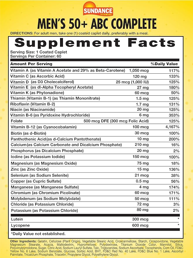 Sundance Men's 50+ ABC Complete Multivitamin | 60 Caplets | with Multimineral Formula | Non-GMO and Gluten Free Supplement