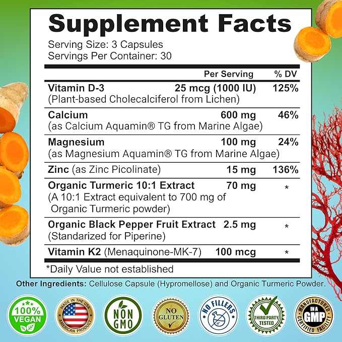 Plant-Based Calcium 600mg (Aquamin) – Vegan Calcium Magnesium Zinc D3 with Vitamin K2 & Organic Turmeric – Enhanced Bone and Muscle Health & Strength, Immune Support for Women & Men - 90 Count