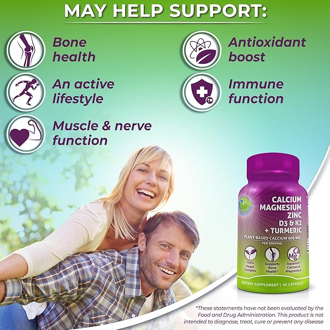 - 7-in-1 Bone Health Complex: Magnesium and vitamin D3 are essential for calcium bioavailability. Zinc enhances magnesium absorption, while vitamin K2 directs calcium to the bones. Turmeric supports active lifestyle and overall wellness, and black pepper improves nutrient bioavailability.