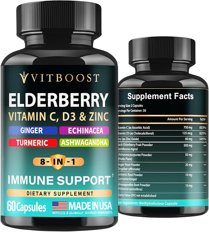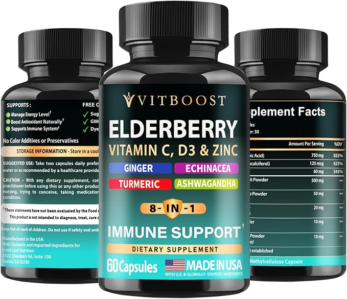 - 8 Key Immune-Boosting Ingredients - Vitboost offers a premium immune booster supplement capsule featuring over 1400mg of essential ingredients per serving. This powerful formula includes Sambucus Elderberry, Turmeric, Ginger, and Zinc Oxide to provide superior antioxidant support. Enhanced with Vitamin D3, Vitamin C, and Echinacea, this supplement is ideal for year-round wellness and daily energy.