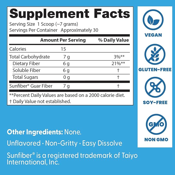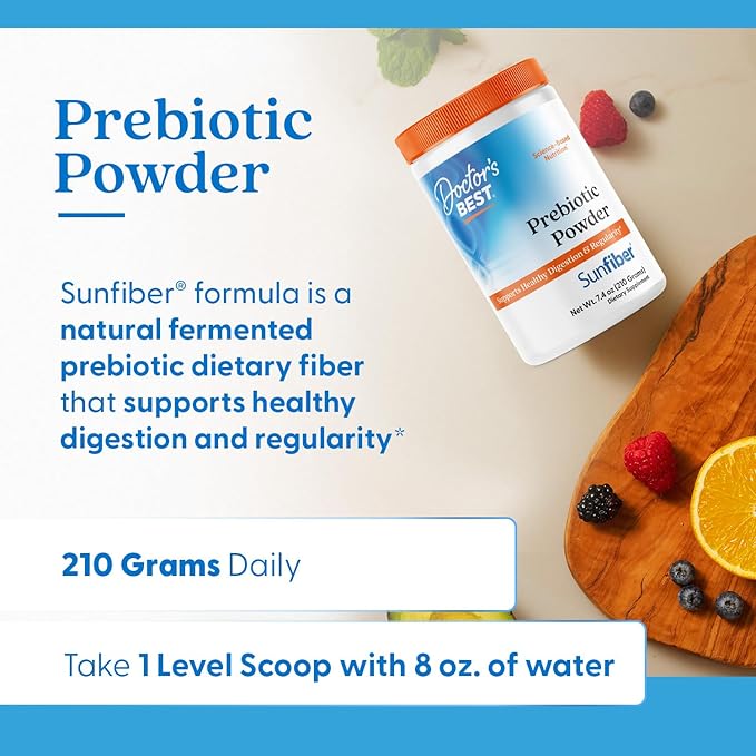 Doctor's Best Prebiotic Fiber Powder with Sunfiber, Supports Healthy Digestion & Regularity, Non-GMO, Gluten Free, Soy Free, Vegan, Unflavored, Non-Gritty, Easy Dissolve Net Wt. 7.4 oz (210 Grams)