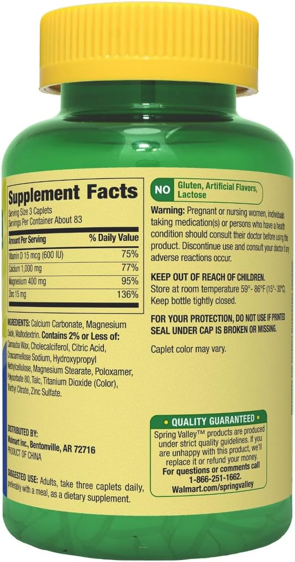 - Convenient Daily Dosage: Spring Valley Calcium, Magnesium & Zinc Comes in a bottle of 250 coated caplets for a convenient daily dosage.