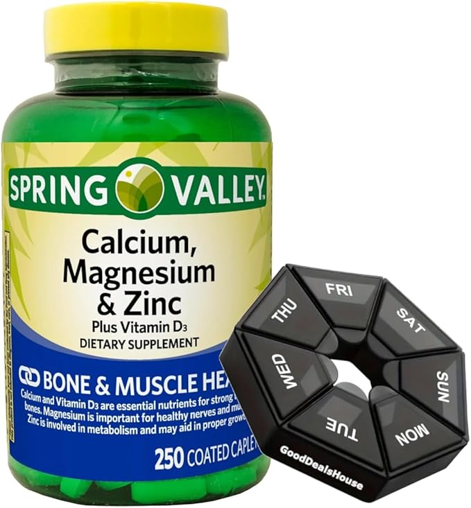 Bundle: Spring - Valley Calcium, Magnesium & Zinc Plus Vitamin D3 Coated Caplets, 250 Count + GoodDealsHouse Weekly Pillbox
