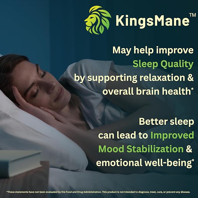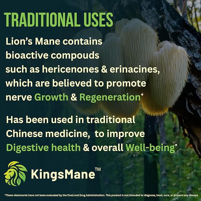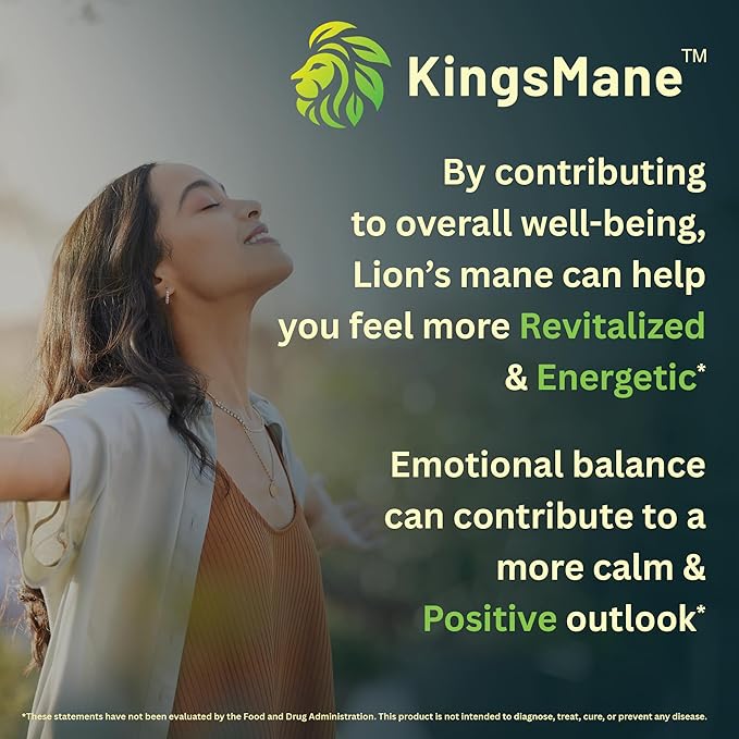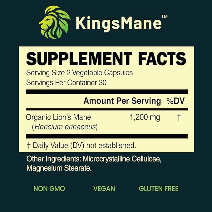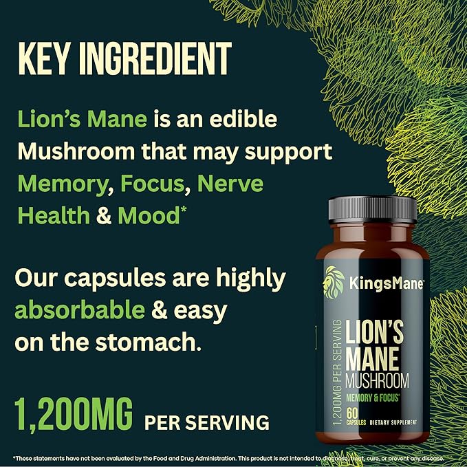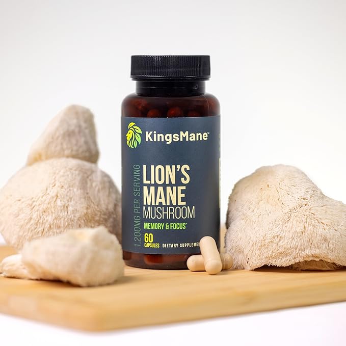KingsMane™ Organic Lion's Mane Mushroom Supplement, Memory, Focus, & Clarity Brain Support, 1200mg, 60 Capsules