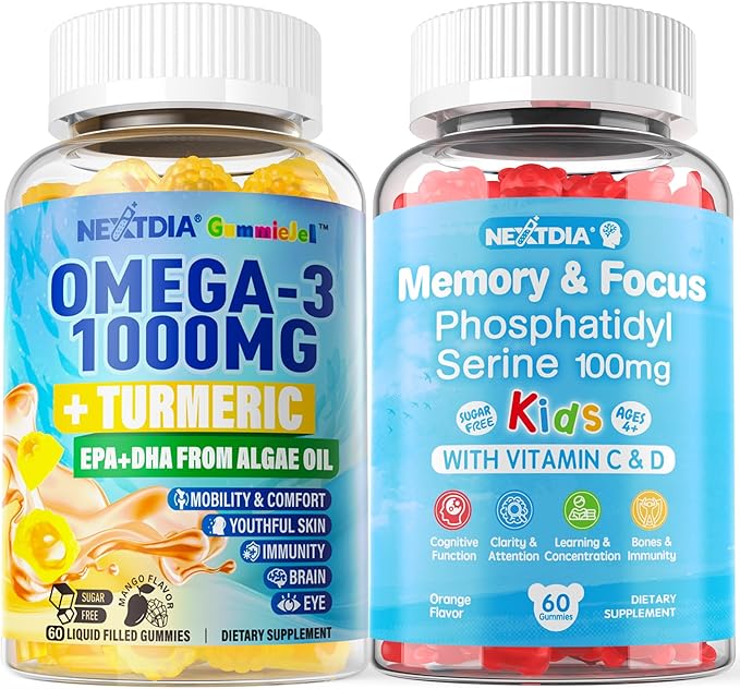 Sugar Free Phosphatidylserine Gummies for Kids 2 Pack + Vegan Omega-3 Gummies 1000mg 1 Pack