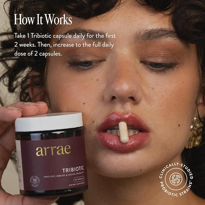 Arrae Tribiotic, Probiotics for Women, Support for Vaginal pH Balance, Gut, Immune, and Feminine Health, Prebiotics, Probiotics, Postbiotics, 60 Count