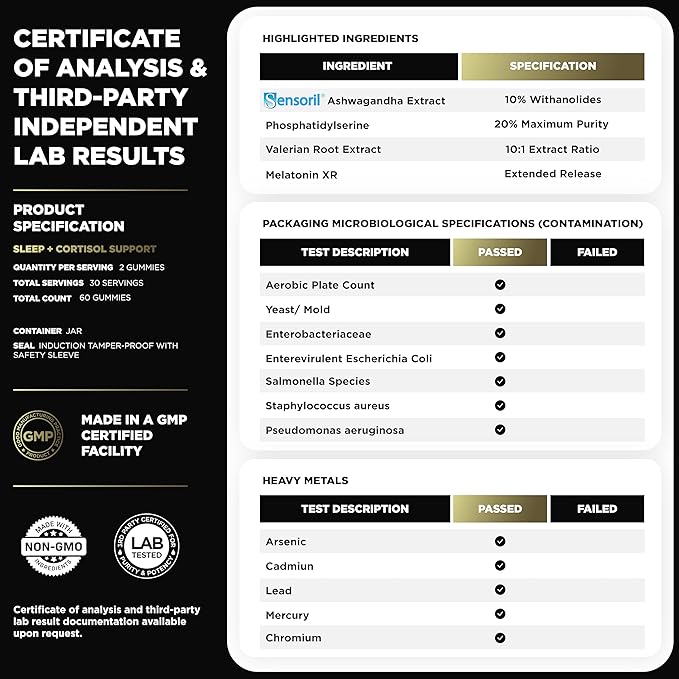 - Special Ingredients : Sensoril® Ashwagandha Extract, Magnesium Glycinate, Melatonin XR (Extended Release), Phosphatidylserine, Valerian Root 10:1 Extract Sensoril® Ashwagandha Extract, Magnesium Glycinate, Melatonin XR (Extended Release), Phosphatidylserine, Valerian Root 10:1 Extract