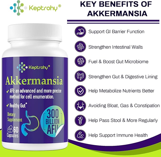 - High Potency 300 Billion AFU Akkermansia Probiotic for Max Results: GLP-1 supplement including akkermansia muciniphila, and our Keptrohy contains 300 Billion AFUs Akkermansia probiotic per serving. Powerful strength Akkermansia probiotic for women & men. Keptrohy provide you with a best GLP-1 supplement for your digestive & gut health, gas, bloating, and Immune support, Enhances and protects intestinal walls, GLP-1 production