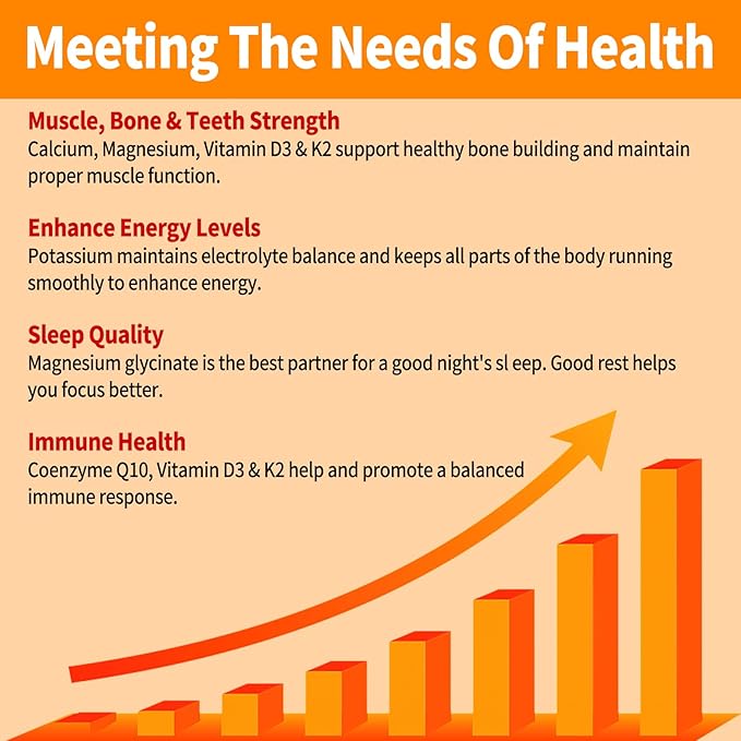 - A powerful combination of minerals and vitamins, these Magnesium Glycinate gummies are designed to support overall health and well-being. Potassium and magnesium work together to maintain optimal functioning in the body, while calcium and Vitamin D3 support bone health. Additionally, the inclusion of Coenzyme Q10 helps boost immunity and energy levels. With a 30-day supply of 60 gummies, taking just 2 a day will leave you feeling relaxed and refreshed, making it an easy and delicious way to incorporate essential nutrients into your daily routine