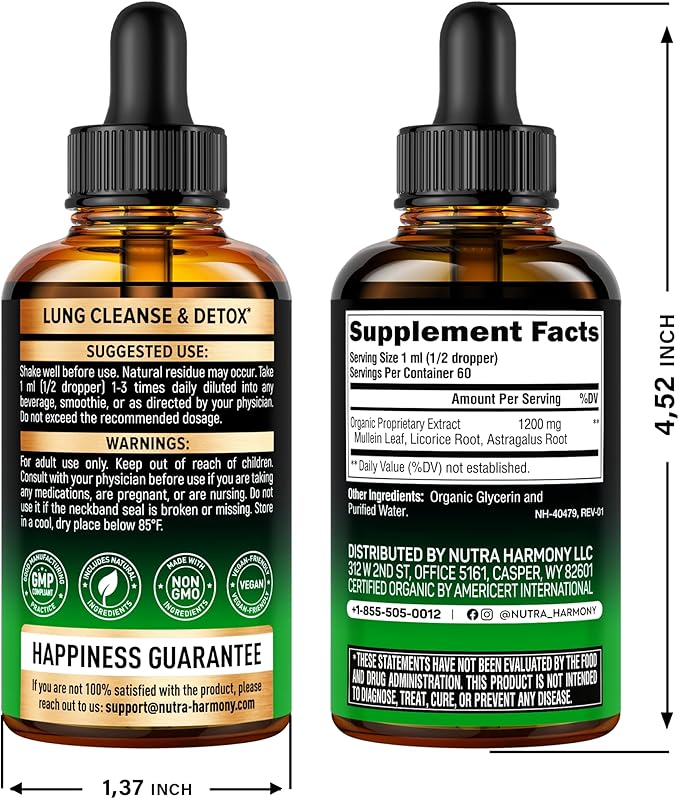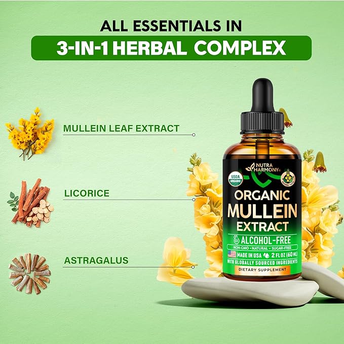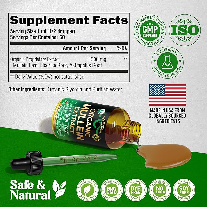 - Natural Formula – USDA Organic, NON-GMO & sugar-free, alcohol-free vegan mullein leaf drops! Mullein leaf extract drops are manufactured in the USA using advanced technology to ensure the finest quality! That's why every drop of lung cleanse liquid supplement is safe, effective, and meets industry standards.