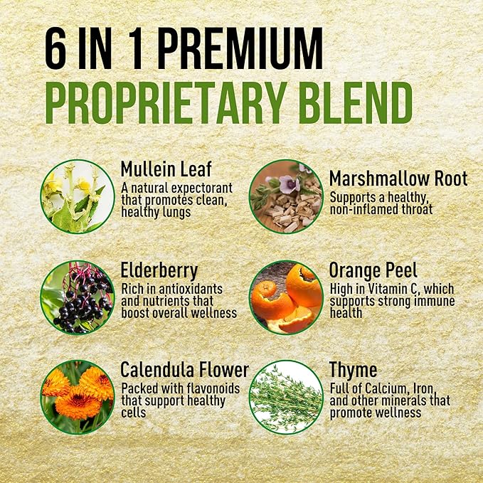 - Keep Breathing Well with Our Enhanced 6-in-1 Formula: Harness the power of Mullein leaf and a premium proprietary blend of Marshmallow Root, Elderberry, Orange Peel, Calendula, and Thyme extracts to support your healthy respiration and whole-body wellness.