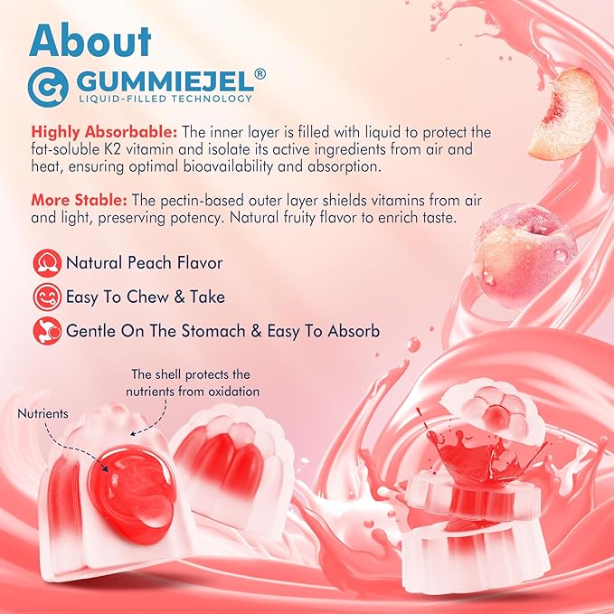- 🍑 Full-Spectrum Vitamin K2 with Trans Form & GummieJel Technology - Our advanced Full-Spectrum K2 Gummies utilize GummieJel technology, encapsulating active ingredients at the core for superior stability, absorption, and bioavailability. The protective pectin outer layer and delicious natural peach flavor ensure a premium experience while maximizing the potency of MK-4 & MK-7. This dual-action K2 formula supports optimal calcium utilization,hḙ-ḁṛt, bone strength in its most effective Trans Form.