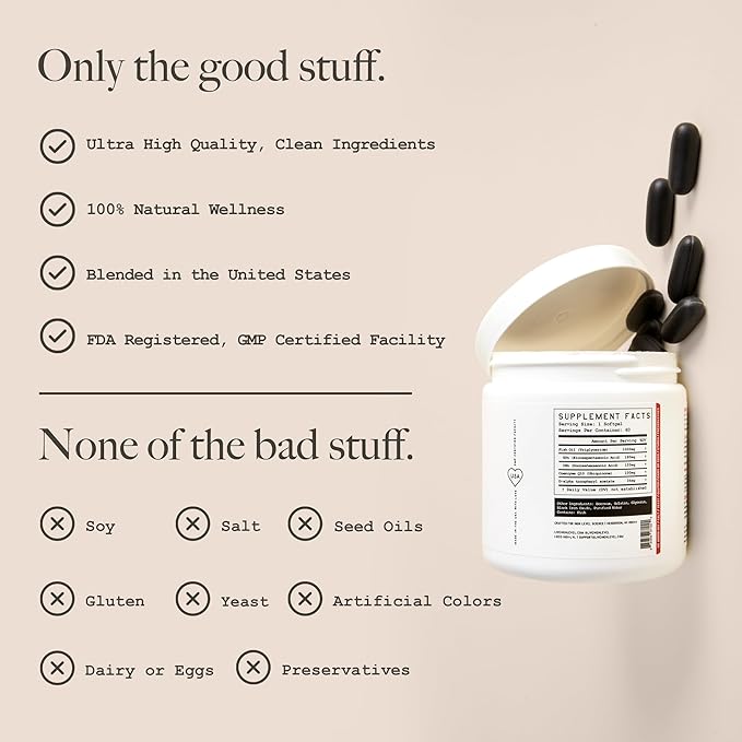 - NATURAL BLACK SOFTGELS FOR PURE PERFORMANCE: Our unique black softgels are naturally colored using earth’s vitamins and minerals, providing an opaque shell that protects the purity of the ingredients inside. Unlike other supplements that use synthetic dyes or artificial coloring, our softgels are crafted to prioritize your wellness without compromise.