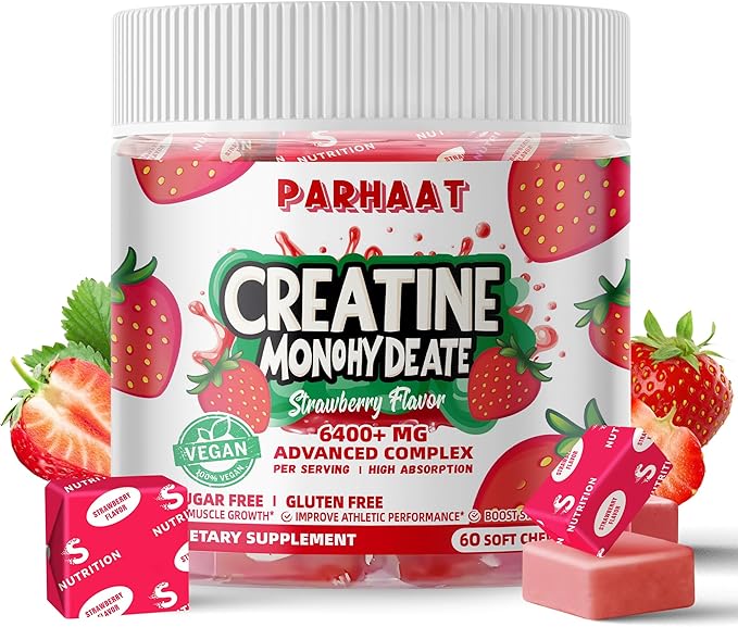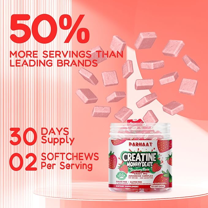 - [Vegan, Gelatin Free, Sugar free]: Each bottle contains 60 count vegan,sugar free creatine monohydrate Chews. Super delicious. Individually wrapped for on the go convenience. features a gummie like candy texture. Each chewy bite is also gluten free.