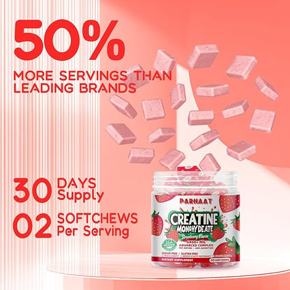Creatine Monohydrate Chews Complex 6400mg for Men & Women -Advanced Formula W/L-Taurine + Vitamin B12, Sugar Free Chewable Supplement,60 Strawberry Softchews