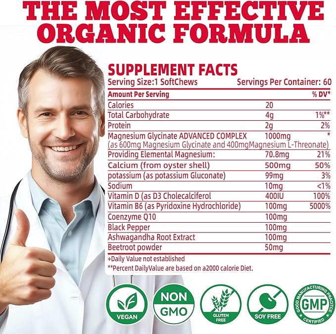 - Powerful House - Our Magnesium Chews Contain Magnesium Glycinate 2500mg, , Vitamins D, B6, Calcium, Potassium, etc. Added Vitamin B6 help magnesium work better, Coenzyme Q10 and potassium help support the mind system and improve Memory and inattention, Vitamin D promotes the absorption of calcium