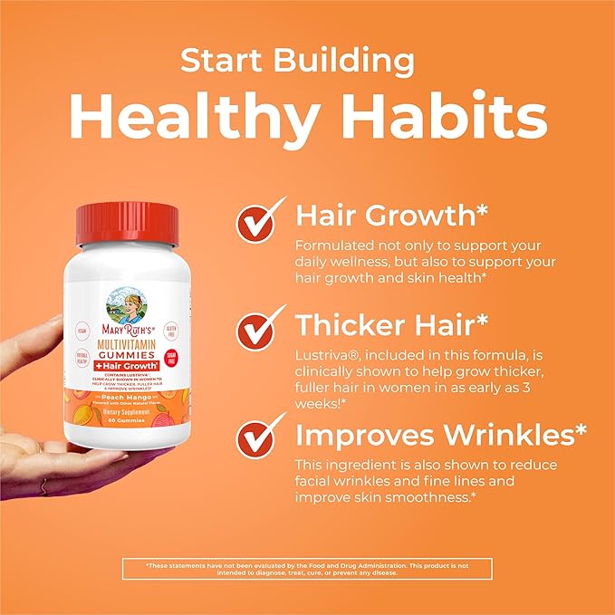 - MARY RUTH MULTIVITAMIN HAIR GROWTH: Containing 13 essential vitamins and minerals plus Lustriva, these gummies are formulated to support your daily wellness plus hair growth and skin health. Lustriva, included in this formula, is clinically shown in women to help grow thicker, fuller hair in as early as 3 weeks! This ingredient is also shown to improve facial wrinkles, fine lines, and smoothness for women.