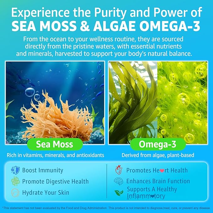 - Immune & Brain Health: Sea Moss, known for its high mineral content, works together with Elderberry, Vitamin C, and Zinc to bolster immune function, and keep your body’s strong. The addition of Turmeric and Black Seed Oil with Sea Moss Gummies promotes comfort. Plus, the combination of Omega-3 and Vitamin B12 helps maintain brain health, making it ideal for those seeking a well-rounded health supplement