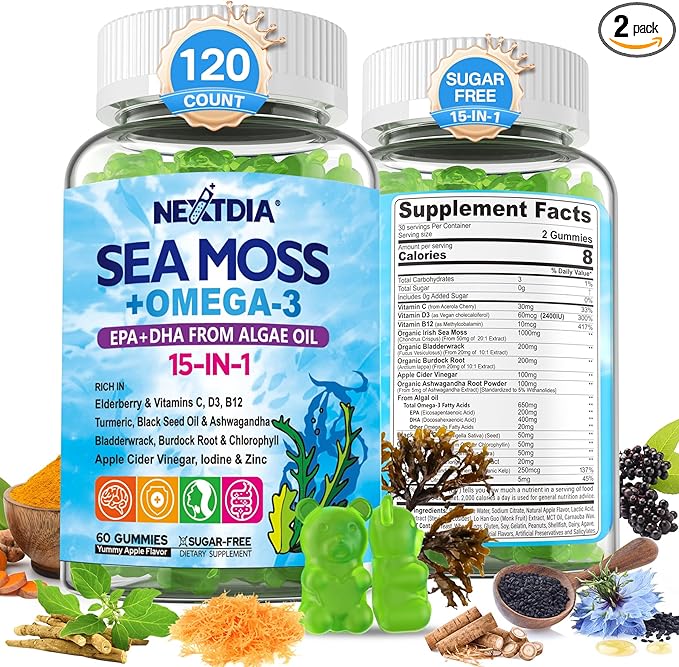 Sea Moss Gummies + Omega-3 Vegan for Man Women, Organic Irish Seamoss Supplement w/Ashwagandha, Turmeric, Elderberry, Vitamins D3 B12 C, Burdock Root, Bladderwrack, for Brain, Energy, Immunty, 120Cts