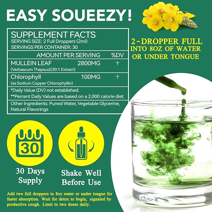 - Mullein Drops for Lung:Mullein leaf is known for its soothing properties and traditional use in supporting respiratory health and overall wellness.Mullein leaf Extract can effectively remove accumulated mucus, clearing your airways, Let you experience more pleasant breathing. This liquid form of mullein extract for lungs organic ensures that our lung cleanse mullein drops for smokers are easy to use.