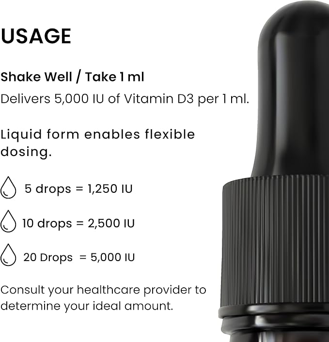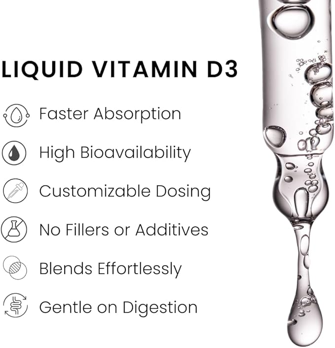 - FAST ACTING LIQUID FORM, FOR BETTER ABSORPTION: Liquid Vitamin D3 absorbs faster and more efficiently than capsules or softgels, making it easier for your body to utilize. Just 1mL (20 drops) per day ensures maximum bioavailability and effectiveness.
