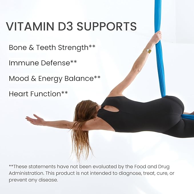- SUPPORTS IMMUNE FUNCTION, BONE STRENGTH AND OVERALL WELLNESS: Vitamin D3 helps calcium absorption, promoting strong bones, muscle function, and a resilient immune system. Essential for adults who may have low vitamin D levels due to limited sun exposure.