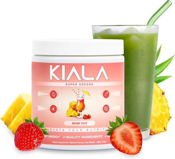 - MIAMI VICE FLAVOR FOR A TASTE OF PARADISE: Escape to the tropics with Kiala Super Greens in the delicious Miami Vice flavor, a refreshing blend of pineapple and strawberry. Say goodbye to bitter, grassy tastes—this vibrant blend is crafted to be enjoyed on its own or mixed into your favorite cold beverages. Supporting your wellness routine has never been easier or more enjoyable with a flavor that brings paradise to every sip.
