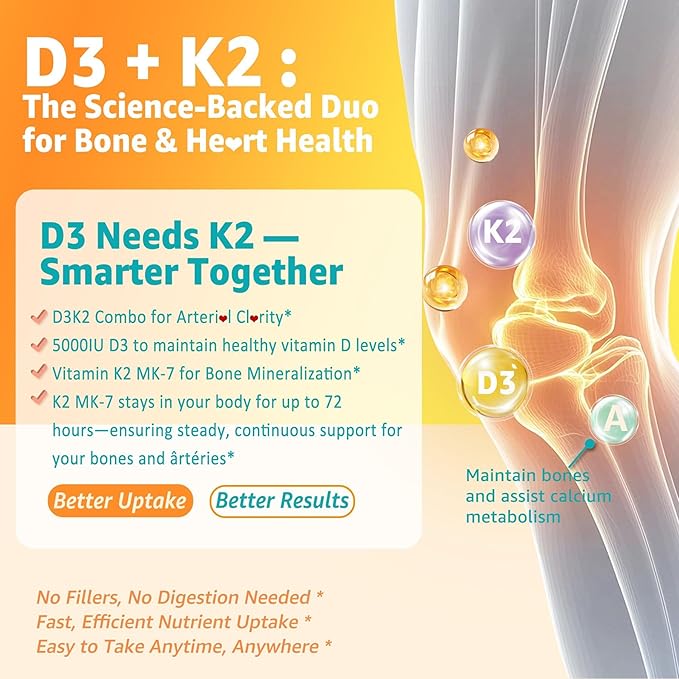 - Stronger Bones & Immune Support: Vitamin D3 and K2 work in tandem to improve calcium absorption, promoting strong, healthy bones. This dynamic duo also boosts your immune system, helping you 𝗌𝗍𝖺𝗒 𝗌𝗍𝗋𝗈𝗇𝗀 𝗒𝖾𝖺𝗋-𝗋𝗈𝗎𝗇𝖽. The liquid drops form ensures easy, fast absorption—perfect for maintaining optimal Vitamin D levels, even during winter or indoors. Feel the benefits quickly as you incorporate this powerful D3K2 formula into your daily routine.