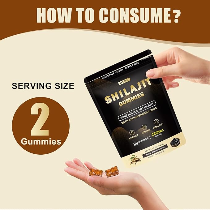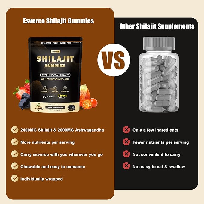 - [ESVERCO SHILAJIT GUMMIES]: ESVERCO specializes in providing consumers with delicious, healthy gummies that contain 2400mg of pure Himalayan shilajit, 2000mg of ashwagandha, 10mg of Calcium, 5mg of Zinc, and 300mcg of Selenium per serving, our The goal is to increase your stamina and replenish your body with the required trace minerals to help keep your body in tip-top shape at all times. You do not need to swallow hard pills. Our brand is designed for men and women, it is convenient for them to replenish the nutrients their body needs anytime, anywhere.