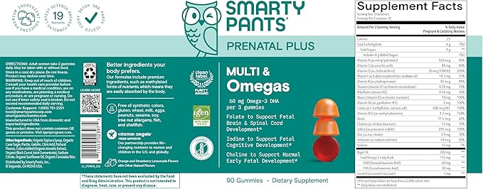 - PREMIUM, SCIENCE-BACKED GUMMY MULTIVITAMIN SUPPLEMENTS FOR WOMEN: SmartyPants Prenatal Plus Multi & Omegas contains 46% more nutrients than the leading prenatal multi* and is specifically formulated to help fill average nutrient gaps.