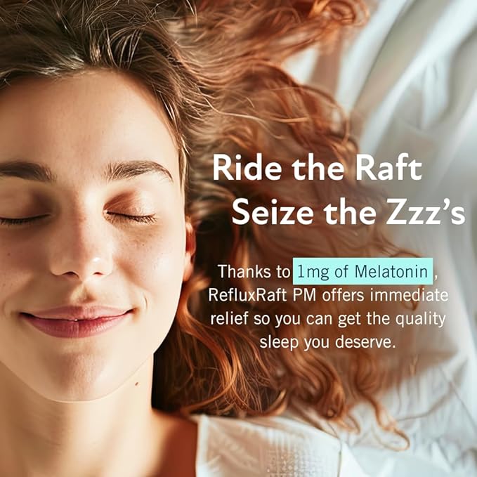 - NIGHTTIME REFLUX THERAPY WITH MELATONIN: RefluxRaft PM is uniquely designed for nighttime use, combining alginate based reflux therapy with 1 mg of melatonin to support digestive health while helping to promote a restful sleep. The Midnight Berry flavor provides a pleasant, sugar free experience, ideal for evening use after meals or before bed.