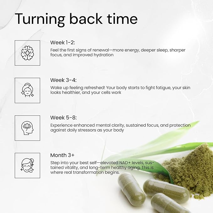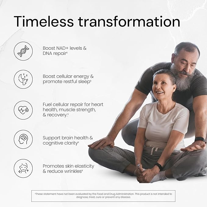 - NAD+ LEVELS DECLINE AS WE AGE: As we age, NAD+ declines, impacting energy and cellular repair. Timeless features Nicotinamide Riboside, shown to increase NAD+ by up to 50%, supporting DNA repair, mitochondrial function, and healthy aging.