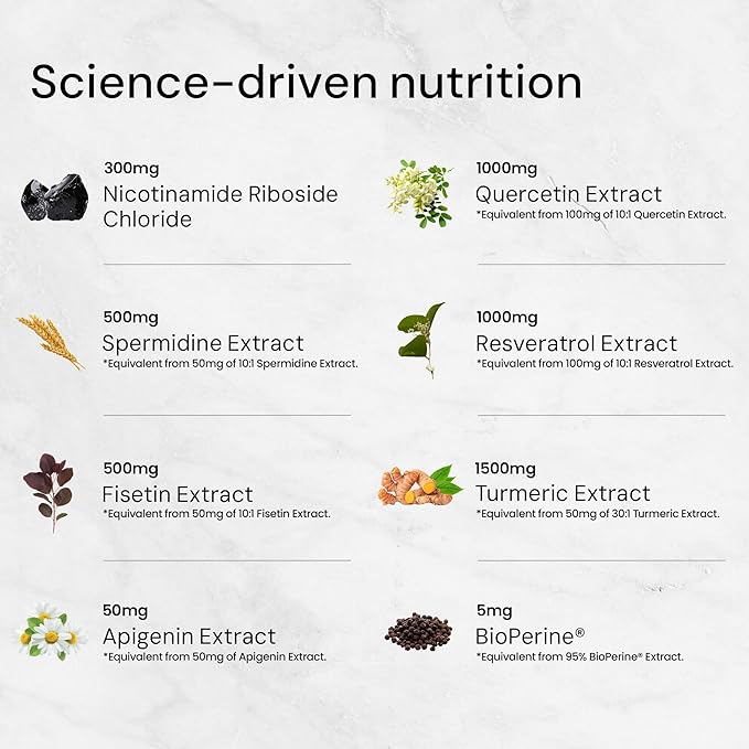 - ADVANCED 8-IN-1 ANTI-AGING COMPLEX: Timeless combines clinically studied ingredients to support healthy aging. Featuring Nicotinamide Riboside, Fisetin, Resveratrol, Quercetin, Spermidine, Apigenin, Turmeric, and BioPerine for enhanced absorption—this formula promotes longevity, cellular health, and energy.