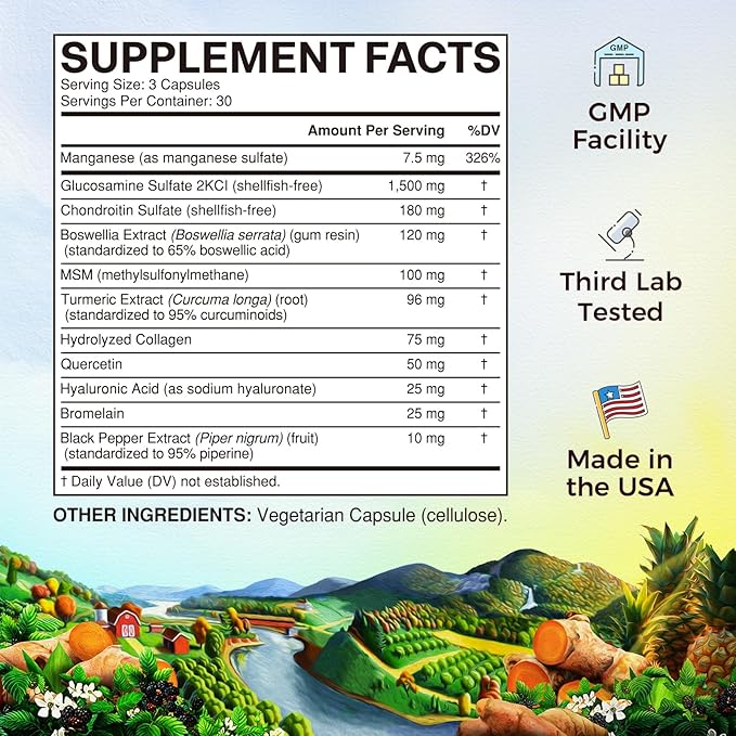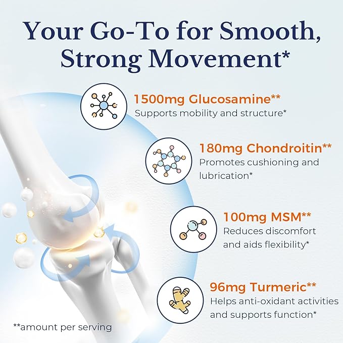 - 11 Carefully Selected Ingredients: With 11 ingredients, including 1500mg repairing glucosamine, 180mg chondroitin, 100mg MSM (per serving) & collagen, bone-strengthening manganese, lubricating hyaluronic acid, free radicals-fighting turmeric, quercetin & boswellia, and bioavailability-enhancing black pepper & bromelain, this product covers all your needs for improved flexibility & comfort.*
