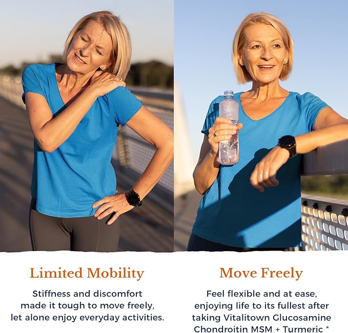 - Mobility, Flexibility, Lubrication and Strength*: Vitalitown Glucosamine Chondroitin MSM + Turmeric is designed for athletes, seniors, or anyone with active lifestyle to promote mobility, flexibility, lubrication, and strength.* This product helps your shoulders, knees, hips, elbows & fingers work like finely-maintained machines.* Make discomfort a thing of the past and regain the freedom of movement with our unique formula.*