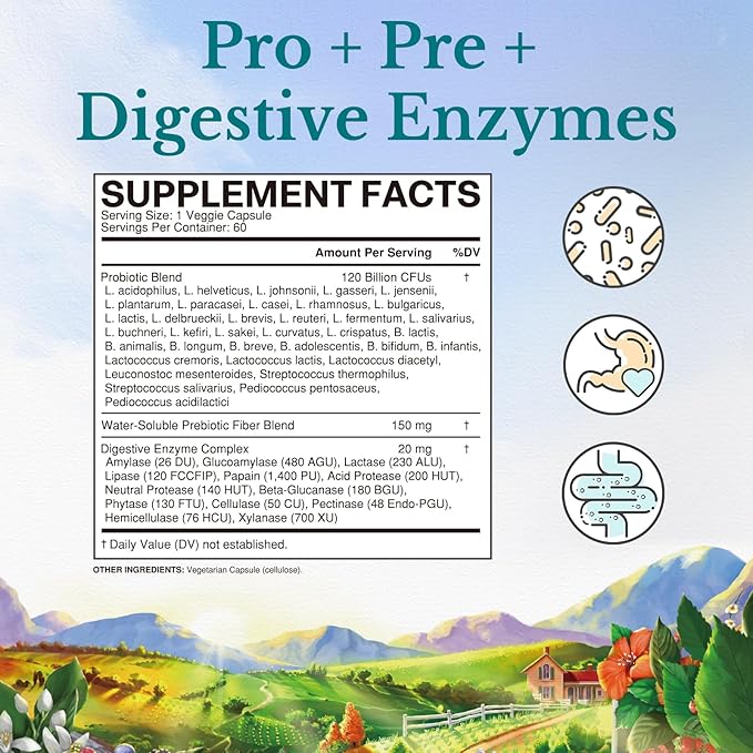 - Probiotics + Prebiotics + Digestive Enzymes: Our Once Daily Probiotics is enhanced with natural plant-based digestive enzymes and water-soluble prebiotics fiber to help reduce gas and bloating.* The three works synergistically to maximize their strength and help maintain natural gastrointestinal tract balance.*