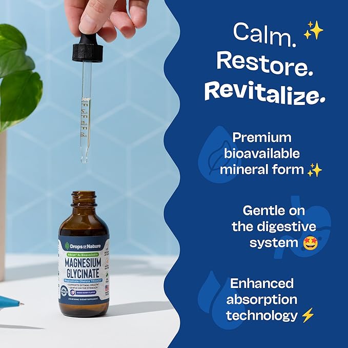 - High Absorption: Supports muscle and nerve function with our highly absorbable magnesium bisglycinate liquid drops, featuring the bisglycinate form for enhanced bioavailability; versatile liquid format compared to magnesium glycinate capsules and gummies
