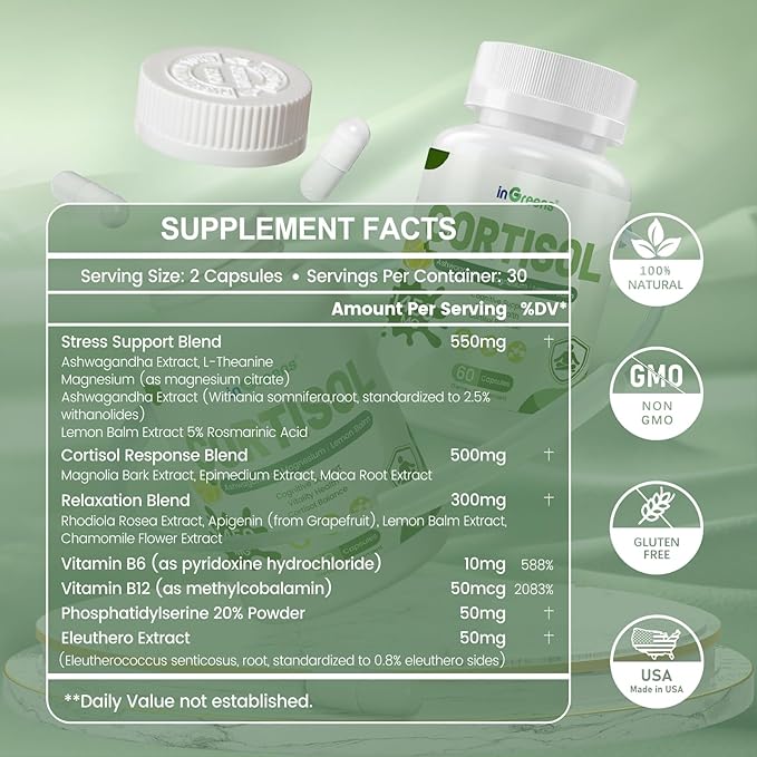 - 【 HIGH QUALITY SELECTION FROM INGREENS】inGreens Cortisol Supplement are manufactured in a GMP food-grade registered facility in the United States using high-quality ingredients from around the world. Our dedication to quality ensures that you can embark on your health journey with confidence