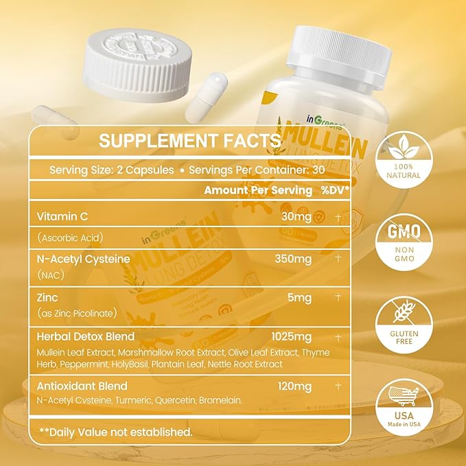 - 【15-in-1 Antioxidant Herbal Blend】inGreens Mullein Herbal Complex contains nature's finest herbs and nutrients, including powerful ingredients such as mullein, quercetin, turmeric, vitamin C, zinc, olive leaf, and holy basil, which work synergistically to enhance lung health and overall wellness.