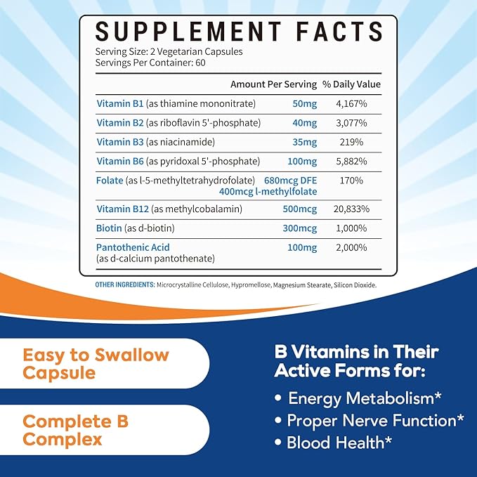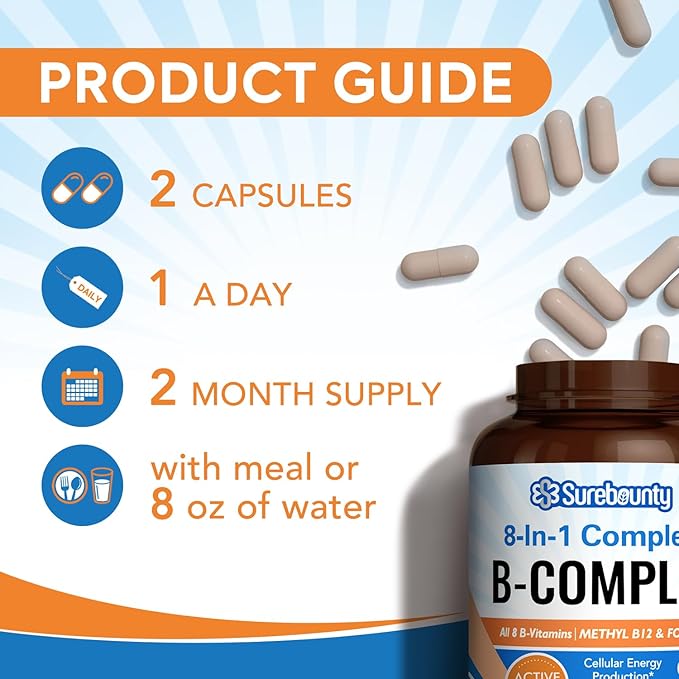 - Complete & Methylated B Complex: Surebounty Vitamin B Complex provides an optimal balance of all the members of the B family in a high-potency blend, helping you support energy metabolism & nervous system.* All the 8 B-vitamins are in their active & body-ready forms, such as P-5-P (B6), methylated B12 & folate (B9), and flush-free niacin (B3), which provide high absorption & long-lasting action.* Take TWO capsules daily, Feel Energized, Recharged and Focused with Surebounty B Complex Vitamins.*