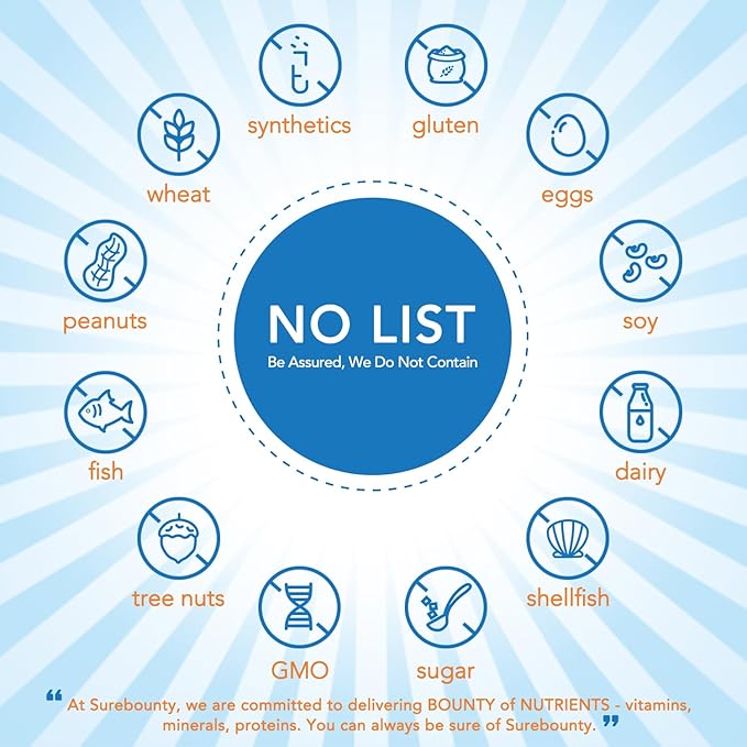 - No Allergens or Nasties: Surebounty has always been dedicated to formulating supplements that cater to people from all walks of life and can easily fit into their daily routines. We want you to enjoy the benefits brought by our Vitamin B Complex capsules without worrying about getting allergic. Be Assured: NO GMOs, soy, gluten, milk, sugar, egg, wheat, corn, nut, fish, shellfish. And never will you find Nasties like artificial ingredients, fillers, binders, or preservatives in Surebounty!