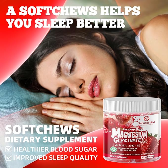 Magnesium Glycinate Soft Chews, Strawberry Flavor.Chewable Sugar Free Potassium Magnesium Chews with Magnesium Glycinate, Vitamin D, B6, and CoQ10 for Calm Support & Sleep for Adults, 60 Days Supply