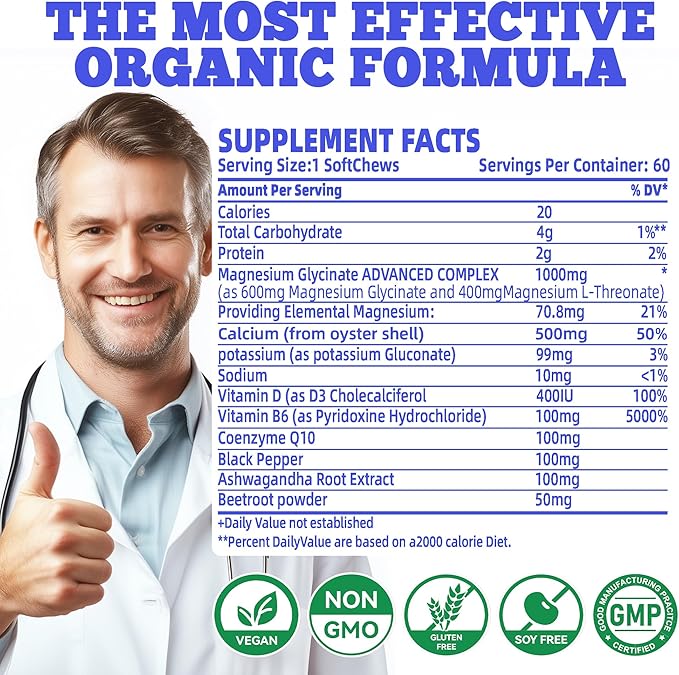 Magnesium Glycinate Soft Chews, Blueberry Flavor.Chewable Sugar Free Potassium Magnesium Chews with Magnesium Glycinate, Vitamin D, B6, and CoQ10 for Calm Support & Sleep for Adults, 60 Days Supply
