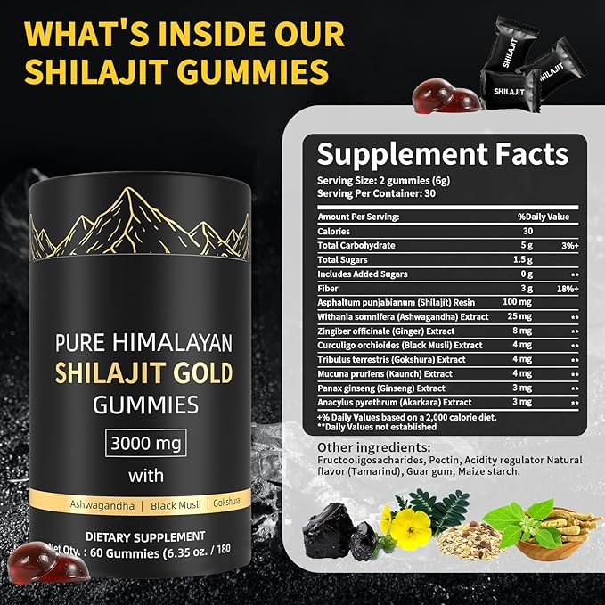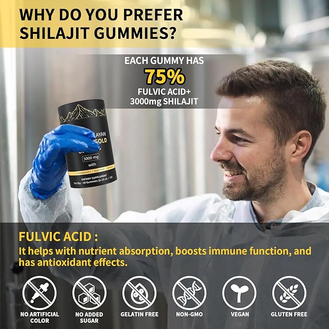 - 【Nature's Energy】Our Shilajit Gold Gummies pack a powerful punch of essential nutrients that are 100% natural and organic. Rich in Fulvic acid, Humic compounds, and 85+ types of trace minerals. Our Shilajit Gold Gummy have no heavy metals or chemical contaminants. It's a must-have for pursuing a healthy lifestyle, boosting energy and helping to enhance workouts!